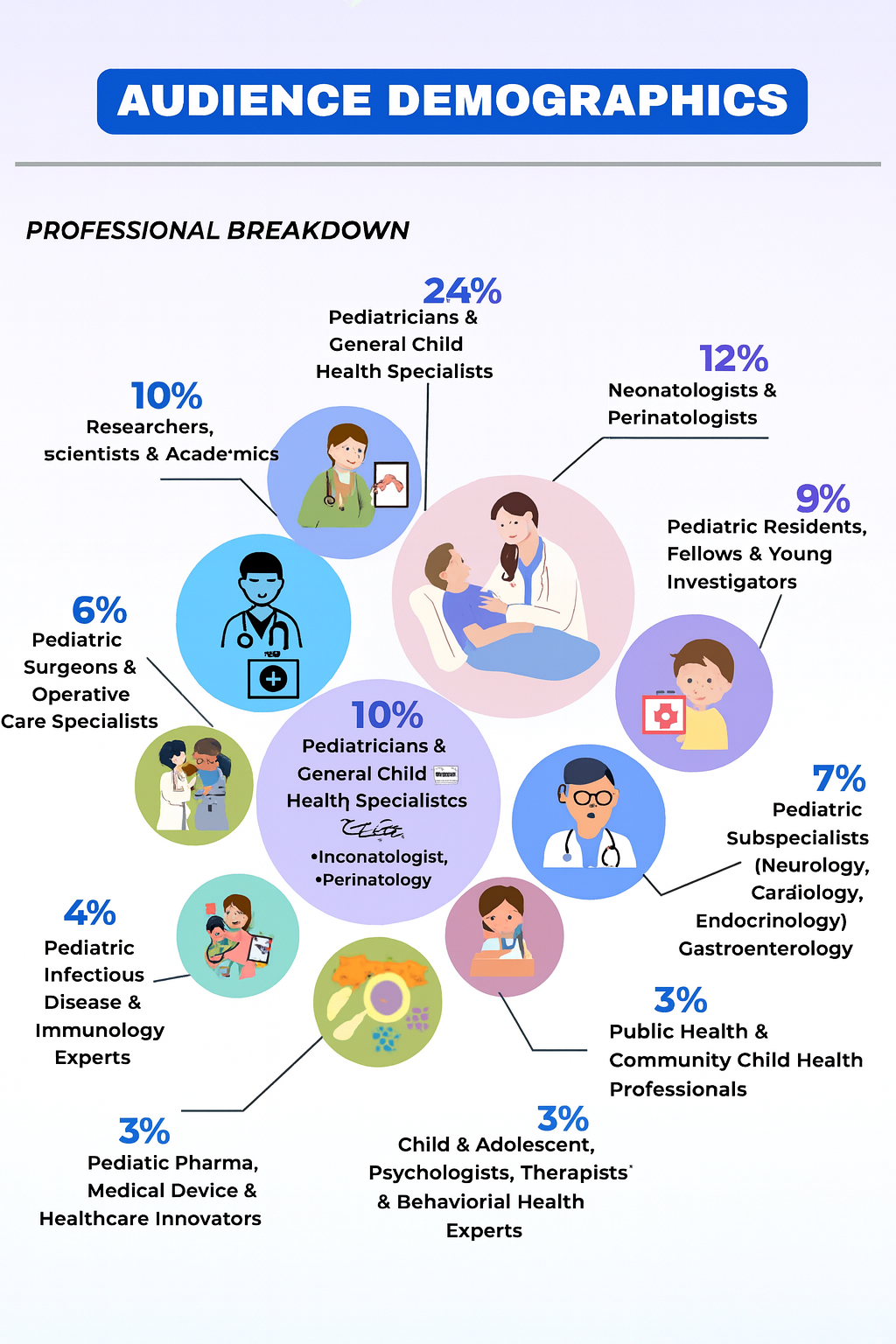 Our congress brings together a diverse and multidisciplinary community of professionals from across Pediatrics, Perinatology, and Emergency Pediatrics Care. The attendee profile represents a balanced mix of clinical experts, frontline practitioners, researchers, academicians, and emerging young professionals. Together, they share a unified commitment to advancing pediatric health, improving perinatal outcomes, and strengthening emergency care for children worldwide.